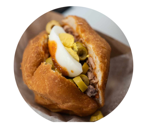 Un petit pain rond et moelleux Tunisien similaire à une brioche, servi avec patate pilée, Harissa, ...